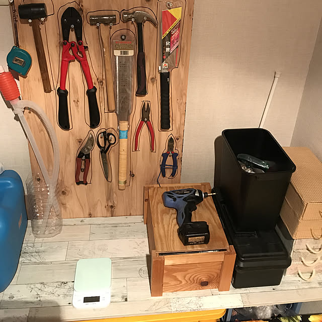 奥のデットスペースの収納棚はDIYしましたが、山善トライビルシリーズのドリルドライバーと丸のこが大活躍しました❤️