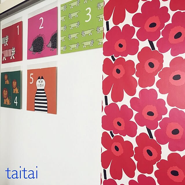 以前サンプリングで頂いたマリメッコの壁紙。余りを子供部屋の本棚に貼りました♪これでほぼ使いきりました~! 華やかな赤ウニッコで一気に女の子の部屋っぽくなりました♥