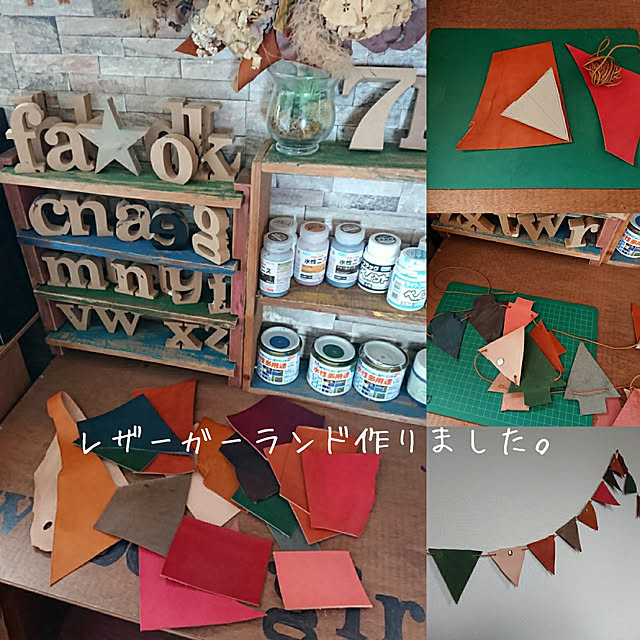 革の端切れと布の端切れで、手作りガーランド★ レザーとカシメでハードな男前仕様です!