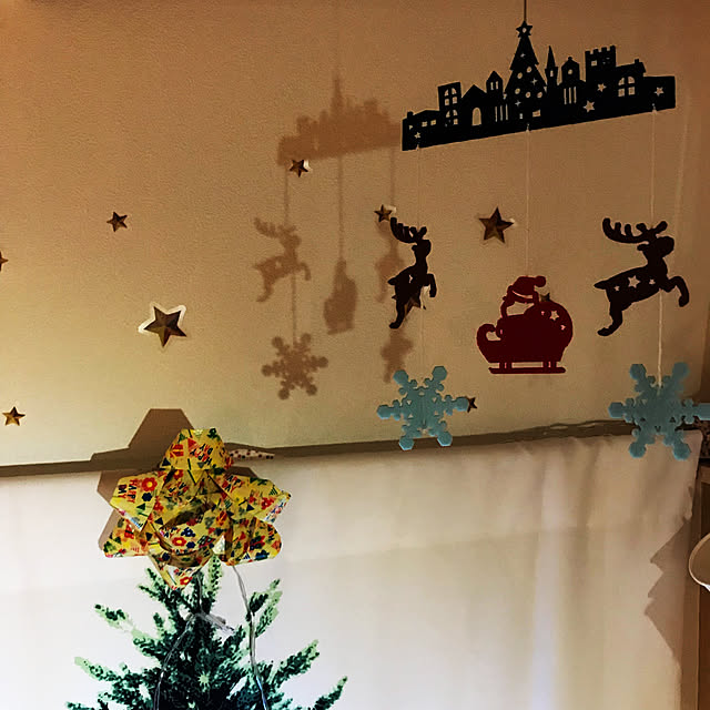 モビールのアップです。 ゆらゆらクルクル回って可愛いです♪ 子供達もジャンプしてモビールにタッチしようと頑張ってます(絶対届かないのに 笑) ガーランド、やっぱり歪んでるので納得いくまで貼り直しまーす(笑) 剥がしやすいので何度でも直せて不器用な私にぴったりでした(ૢ˃ꌂ˂⁎)
