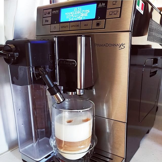 デロンギのプリマドンナxs 美味しくて何杯も飲まずにはいられないので、豆はデカフェにしています🤣 特にカフェオレが秀逸ですが、ミルクをきらしたらアメリカンも美味しい。 お手入れも簡単です✨️