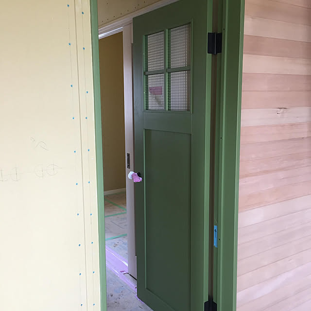 階段横にあるビンテージのステンドグラスに使われているモスグリーンと同じ色に。ビンテージの風合いを出す為に所々に傷も付けて…。