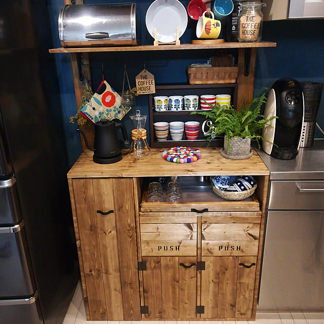 うちは、パントリーというお洒落な収納はありませんしそもそもの収納も少ないお家なので旦那DIYの見せる収納です。 ざっくりと、籠に詰め込んでます。 これが、まぁ便利で 母の掛け声ひとつで子供達も自ら進んでコップやお箸を出して食卓へつきます(圧)笑