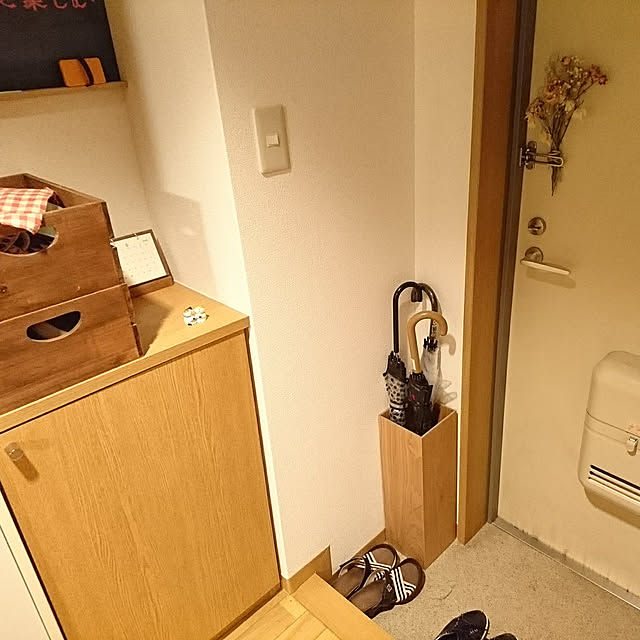 玄関。傘立ては備え付けのものではなく、ニトリで買ってきたものです。 置き場の無いドライフラワーがドアにくっ付いていたり、 これまた置き場の無い食器が、木箱に詰められて靴箱の上に乗っていたりします・・・。 1Kならでは!です。