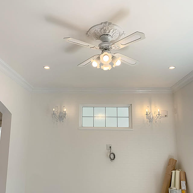 リビングの照明も付いてまぁす🥰💕 エアコンの効きを考えてシーリングファン付きにしました❣️ ウォールランプは付けたかったやつが廃盤で激安のやつ😆 FIX窓の下に壁掛けテレビの予定〜👍 でもこの窓…左右対称でお願いしてたはずやのに…向かって右に寄ってる😱😵😑 めっちゃ気になるけど今更どうにもならんやん😭 はぁ…気になる…😑