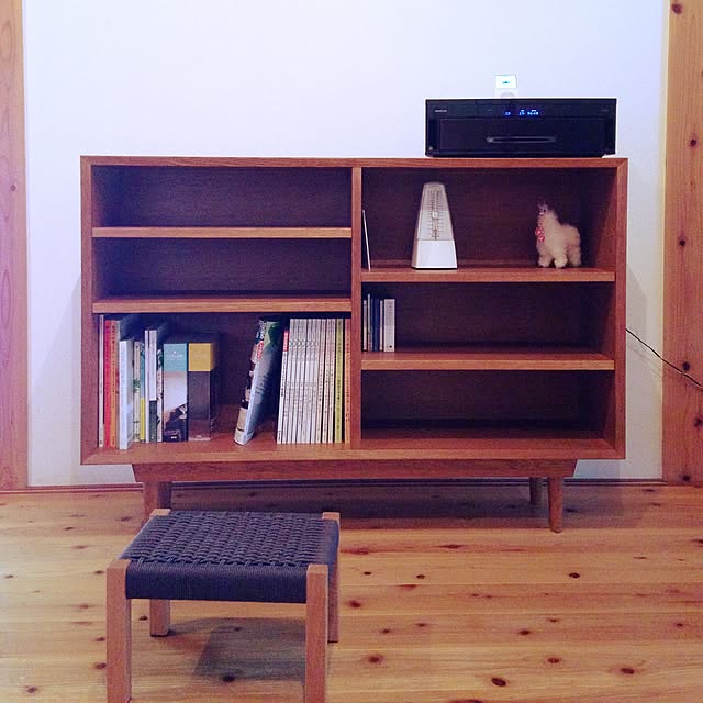 ホームセンターで買った木で作ったブックシェルフ。天板はレンガのカッティングシートを貼ってアクセント。