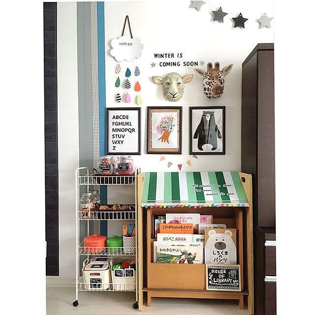 リビングにあるキッズスペースの雲形モビール。 市販のものは結構お値段もするし、なかなか気に入ったデザインのものが見つからなかったので、100均で材料を調達して手作りしました♬ カラフルな感じの雨がお部屋にぴったり٩(⑅´◡` )۶٩( ´◡`⑅)۶ᵋᵎᵌ⁎४*✧ ハンドメイドだと自分好みにできる(●˘͈ ᵕ˘͈)