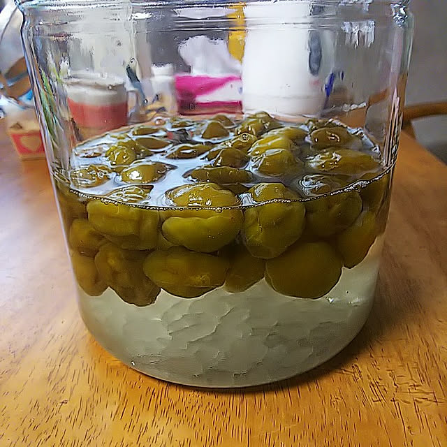おはようございます! 今日も朝からどんよりしてます やっと梅仕事、仕込み終わりました 1日目:黄色南高梅を買う 2日目:なり口を取り、洗って、水に一晩漬ける 3日目:梅の水分を拭き取り、ジップロックに入れて冷凍庫へin 4日目:ガラスキャニスターを買う(3L) キャニスターを洗って熱湯消毒、一晩自然乾燥 ☆本当は、煮沸消毒が良いのだけれど、このキャニスターが入る大きさの鍋がなくて…熱湯を注いでしばらく置いてから、自然乾燥させました 5日目:梅、三温糖とともにキャニスターへin! 同時に、RCで出会った方に教えてもらったキウイジュースも作ってみました! ☆三温糖にしたのは、ちょうど買い置きしてあったのが、これだったから!…と、氷砂糖より溶けが早く、発酵しにくい…とも聞いたので! ☆梅を凍らせたのも、エキスが出やすいと聞いたから! 聞きかじりのやり方を集めて、やってみました! あとは、毎日欠かさず、瓶を数回上下して…早くエキスが出るのを楽しみに待ちます♪
