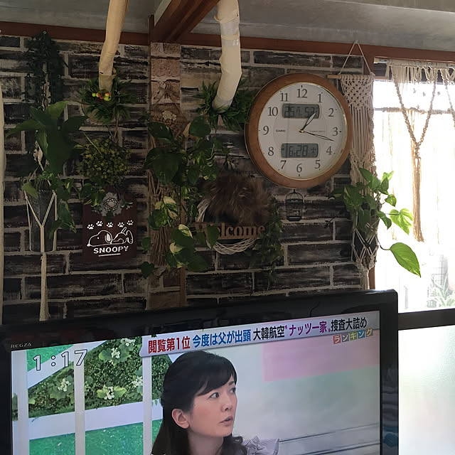 私の座る位置から ずっと見ていられる様に テレビの上の壁にwelcomeのリースも❤️