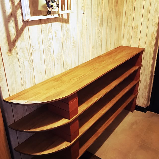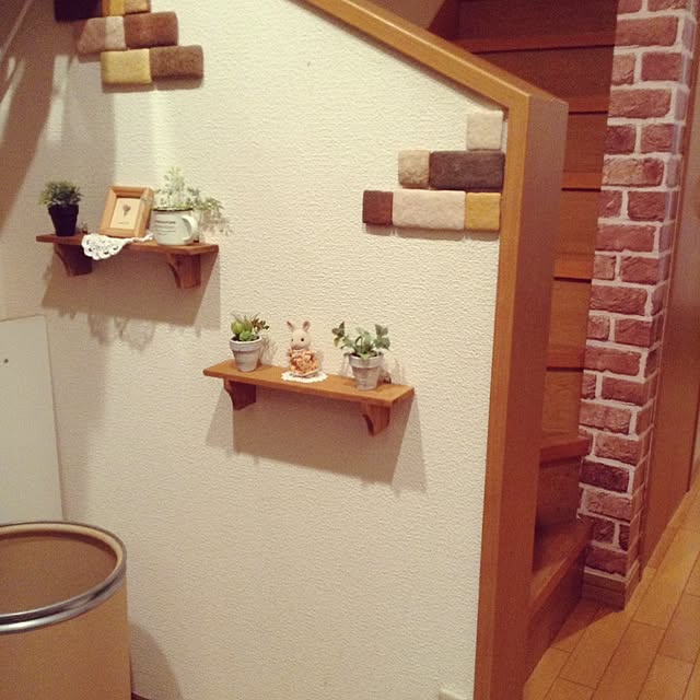 壁に貼っているレンガ調と棚すべてリメイクシートです。(鏡に写っている木目調も)手前の靴箱は元の茶色からホワイトの木目調にして統一感出しています😊