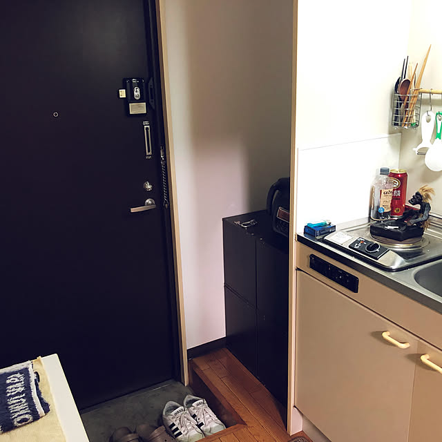 レース編みを 玄関からキッチンへの入り口のドアの目隠しカーテンにしています。