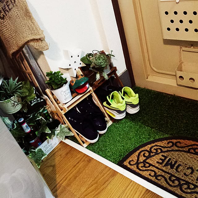 玄関に置くといいと言われている カエルの置物を、 チャイハネに買いに行きました。 玄関が暗めだったので、 人工芝を敷いてみました。 娘には、 牧場目指してるの? と言われましたが…。