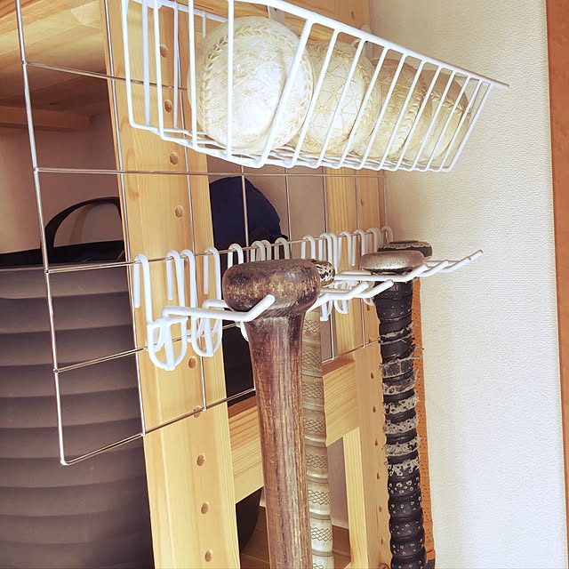 ちょこっとバージョンアップ。 グローブとボールをカゴに入れられるように! フック付きのカゴは3COINで買ったよ♪