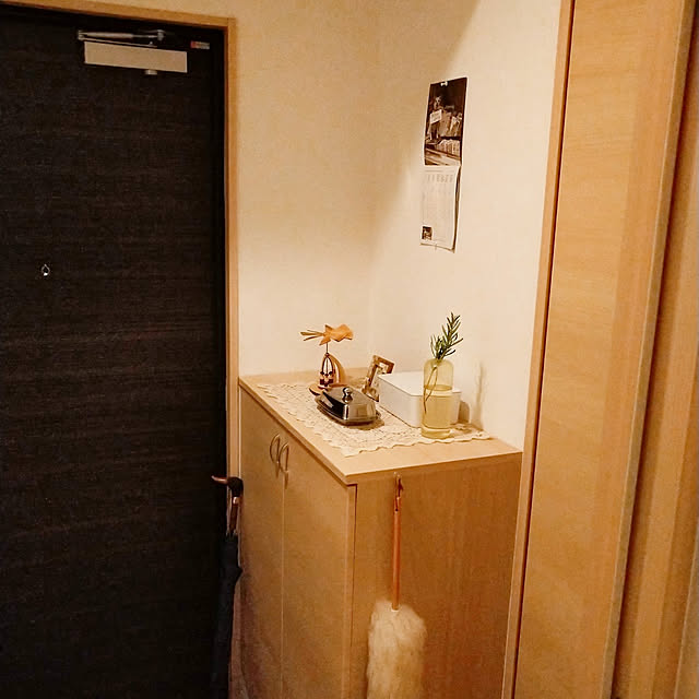 玄関床が淡いピンク色のクッションシートで可愛いのですが、雨の翌日は汚れが目立ちますね…(;つД`) カフェカーテンの向う側は磁石で貼り付ける鏡とドアスコープがあります。