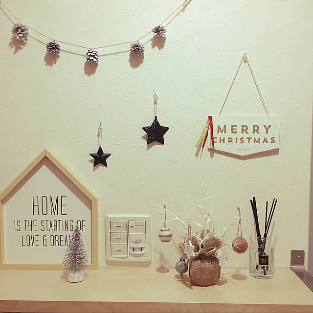 枯れ木を白のアクリルスプレーで塗って、森で拾った松ぼっくりを白くペイントした物とそのままの物、手作りの蔓で編んだリース、星型リースを飾って、ナチュラルなクリスマスツリーを作りました。