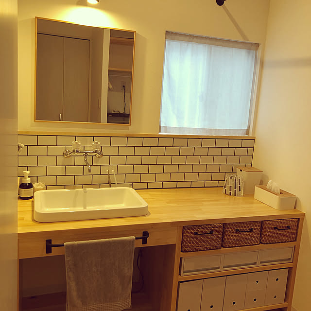 家事室兼洗面脱衣室。造作の可動棚は洗面台と合わせたので、かなり奥行きが深め。 ピッタリのカゴを探して、ようやく見つけたのは某通販雑誌のキッチンラック用のカゴ。 ナチュラルだし、内布もあるし、何よりピッタリサイズがお気に入り(o^^o)