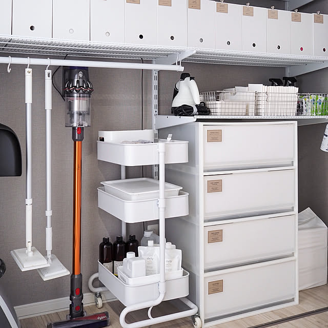 お掃除グッズをニトリのスリムワゴンに入れてます☺︎洗面台やキッチンなど、掃除する場所の近くまでゴロゴロ転がしていけるので便利です。 普段は見えないように、収納スペースに閉まっています♪