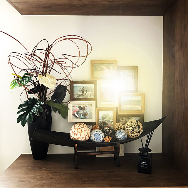 玄関はアジアン雑貨でまとめてます 3色の写真立てを組み合わせてDIY 幼い頃の子供達の写真を入れてます Fragranceはニトリの ✨SAND GRAFFITI✨ 強すぎすぎないところが好きです リピしてます