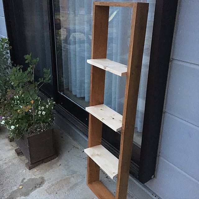 それでも諦めきれなくて、今回吊り下げ式ラダー擬き作っちゃいました。吊り下げというよりは棚…。ふと、いろいろ試行錯誤してる時に思いついたのがこの場所…。玄関の下駄箱の上…。目線も全然高く、壁際だから邪魔にならないし…。早速、我が家の職人さんにお願い。(笑)(°▽°)どの角度からみても『吊り下げラダー』にみえる…。感動‼︎いつもの事ながら、これで充分…。中には前から使ってるCDシェルフの底を取って横置きに…電球ガードは、そのままでも良いような気もして…。でもやっぱりブラックにペイントしなきゃ…。