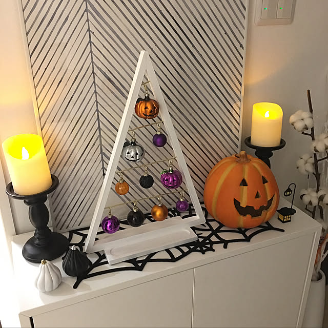 玄関でも、ピッタシな隙間にディスプレイテーブルを配置したり、靴箱上にランタンを設置するなどして、ジャックオーランタンが悪しき何かを退ける魔除けとして機能する様子を表現。