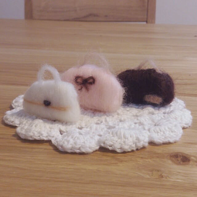 そんな子達🐻❄️🐒🐤🐻に、バッグやベレー帽や首飾りを作りました。お揃いのチョウチョを添えて⚮