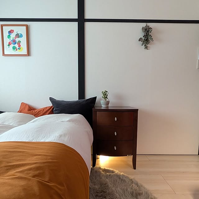 自然素材ならではの優しさや落ち着きを感じられる部屋にしたくて木製家具でまとめています。 お気に入りはベッドサイドの間接照明です。