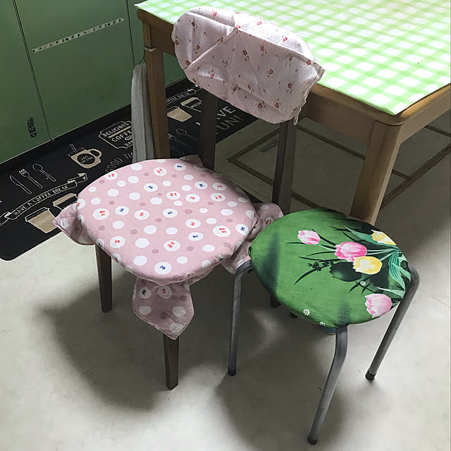 🌟2つのオンボロの椅子💺 カバーを手作りするのは面倒なのでハンカチや座布団カバーを縛ったり紐で括り付けただけです😅 右の緑の椅子はキッチンに置いてちょこんと座ったり踏み台にしていたのですが、私が歳をとり、なんせグラグラする😂 左のしっかりしたピンクの椅子をキッチンに置く事にしました💺
