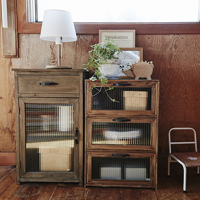 木肌の濃淡が味わい深いシリーズです。取っ手やレトロガラスの窓が可愛ら