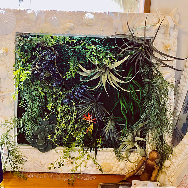 Seriaのフェイクグリーンを使い、自作のウォールグリーンパネルを飾っています。