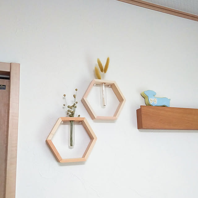 六角形の一輪挿しフラワーベース。 やっと壁掛けにしましたよ😄💦 📌に引掛けているので、万が一のことを考え、ドライフラワーを✧