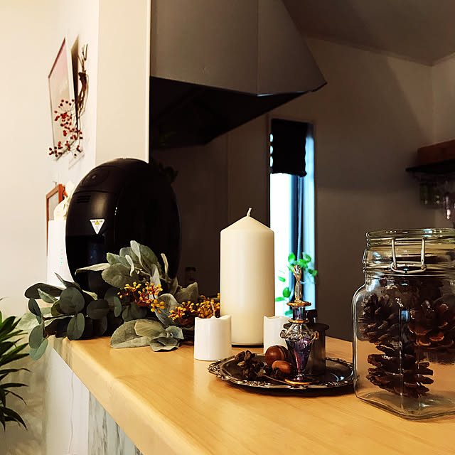 松ぼっくりにシルバーを塗って ちょこっとだけ…雪っぽく?したものを 瓶に入れてみただけ それだけの画像。