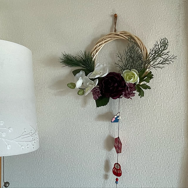 右:3コインズのしめ飾りを少しアレンジ。いなざうるす屋さんでGETしたグリーンフェイクの草?を