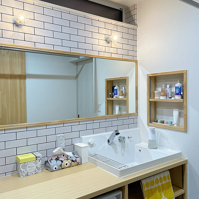 ルームクリップはじめてから、少しずつ、、、 ペンキを手に持ち、ニッチを白く!!! ノコギリギコギコ何かを作る!!! ミシンでチクチク何かを作る!!! そんな毎日^ ^知らぬ間に私の趣味、発散方法になってました♩♩ ここの洗面所のニッチも白くして、植物を育てやすいアイビーに変えました❤️ 化粧品は、アルビオンとイグニスがお気に入り^ ^見た目もすごく可愛いボトルで、使い心地も好きです❤️ ティッシュケースはクリアの無印良品!! これも水気の飛ぶ洗面所にぴったり!! お気に入りです( ´ ▽ ` )