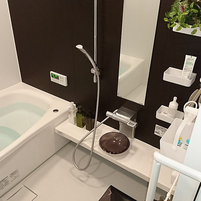 バスルームからこんばんは〜(*⁰▿⁰*) シャンプーボトルなどをニトリのラックに入れてます。 シャワーヘッドのホルダーに差し込んで吊り下げているので、ボトル達の底はヌルヌル知らずです。